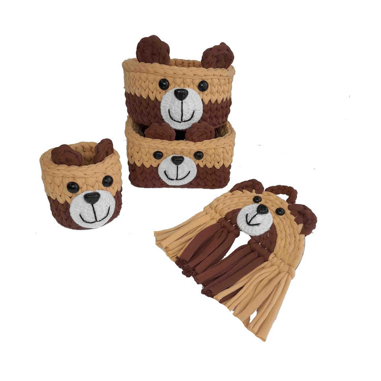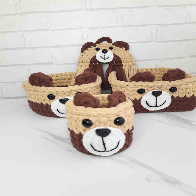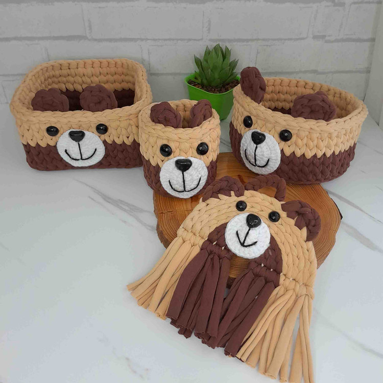 سبد قلاب بافی تریکو طرح خرسی مجموعه 4عددی که برای نظم دهی به وسایل سیسمونی نوزاد ، آرایشی بهداشتی و تحریر مناسب میباشد . این مجموعه شامل یک دیوار کوب سایز 15 سانتی متر یک سبد گرد سایز حدودا 10 سانتیمتر .سبد گرد قطر 17 و ارتفاع 12 سبد مربع 17 × 17 سانتی متر میباشد.