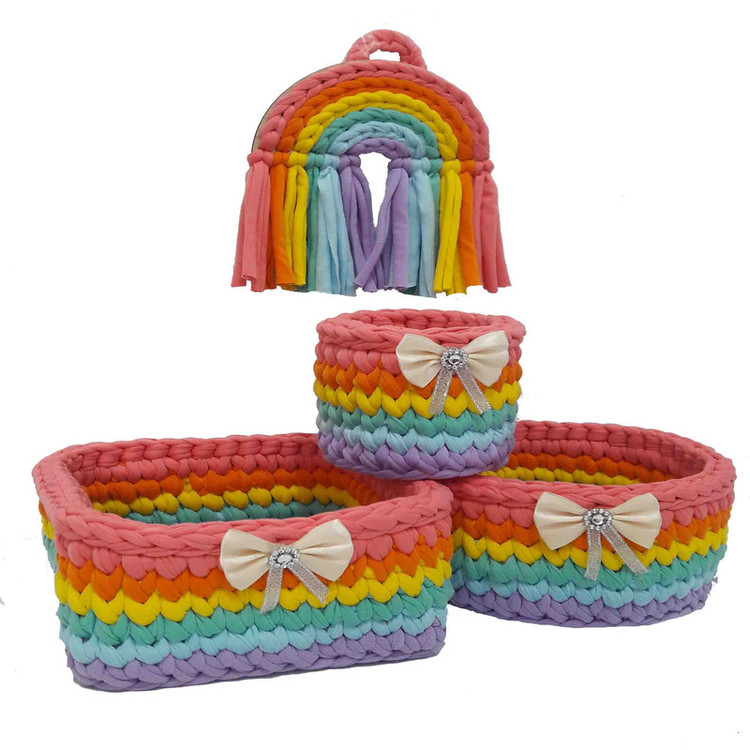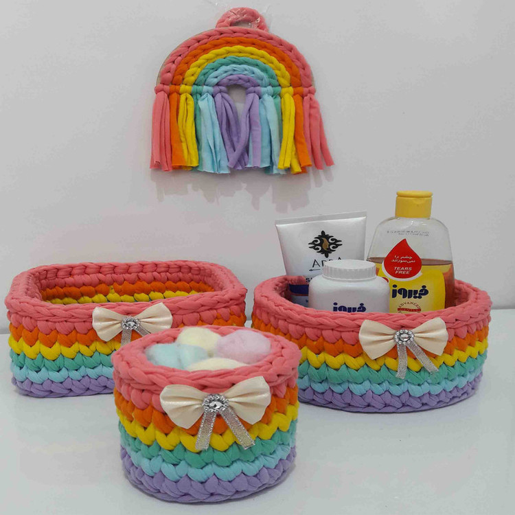 این ست سیسمونی شامل 3 سبد میباشد سبد گرد 8 سانتمتر و ارتفاع 9 سبد گرد قطر 17 و ارتفاع 9 سانتی متر سبد مربع 17 x17 x9 سانتی متر و دیوار کوب زیبای رنگین کمان